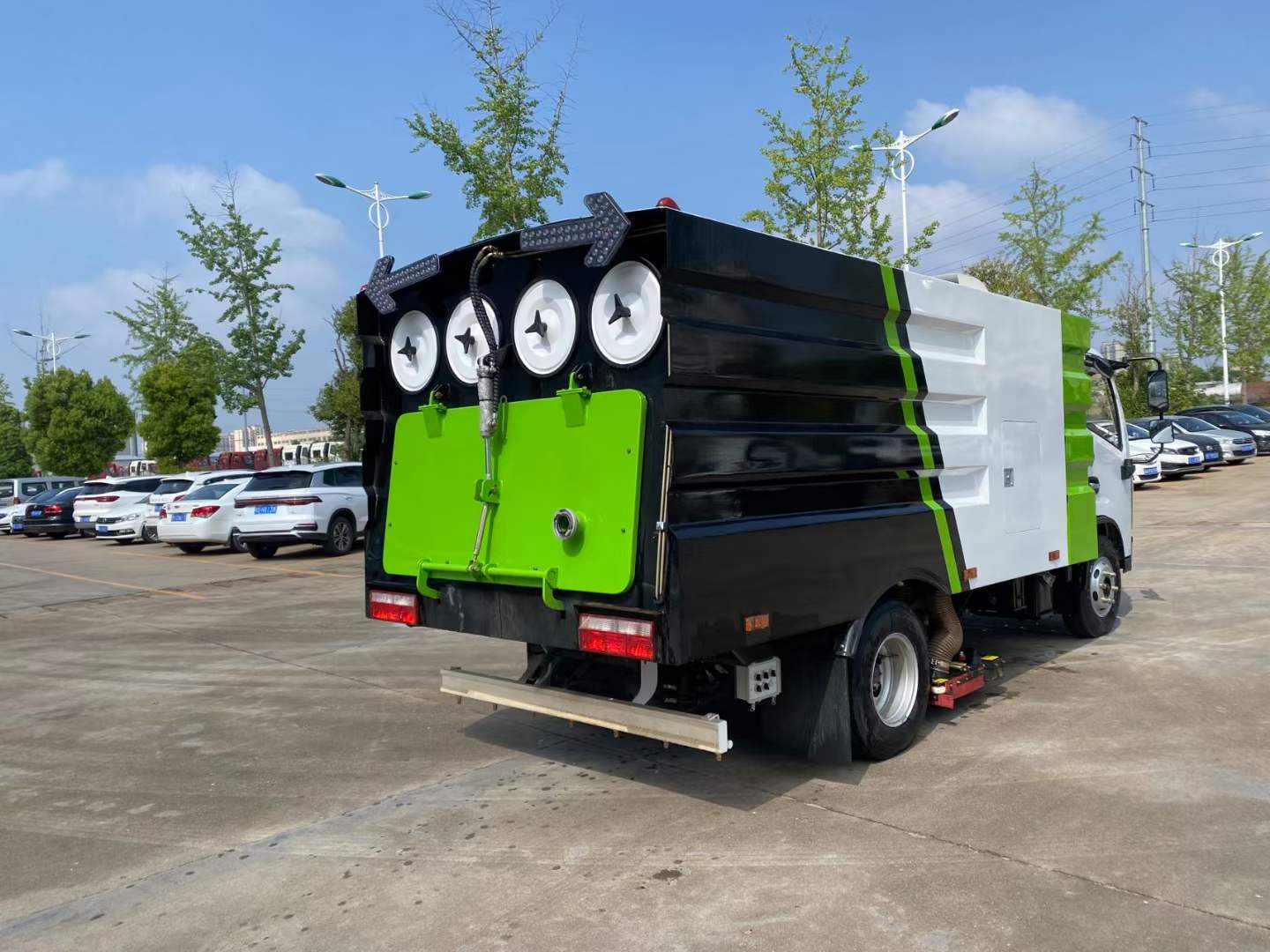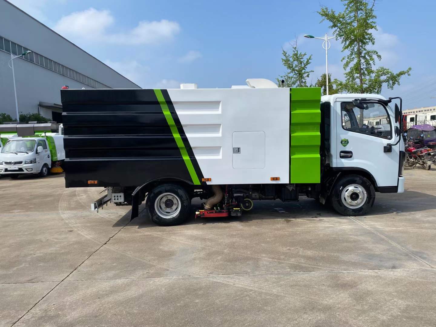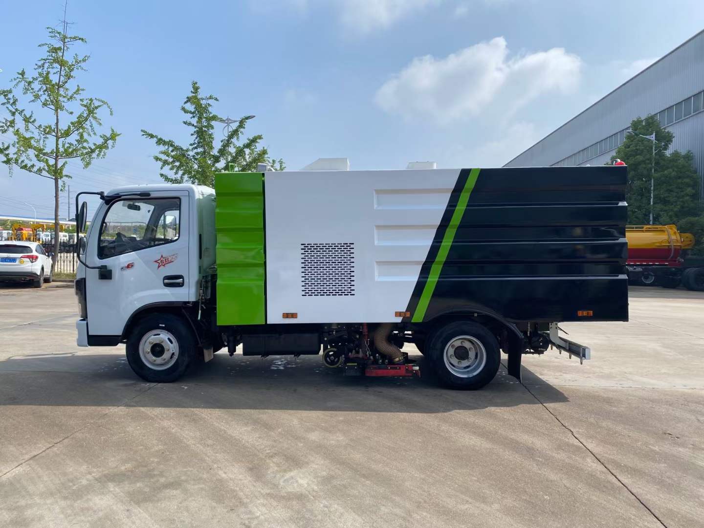 隨底盤選裝駕駛室;選裝后部結構樣式.僅采用3308mm軸距;側防護由專用裝置吸盤代替;后防護材料Q235,焊接連接,后部防護斷面尺寸(mm):120×50,離地高度(mm):400;ABS型號/廠家:ABS/ASR-12V-4S/4M/襄陽東風隆誠機械有限責任公司;該車主要由箱體和吸塵裝置組成,用于路面垃圾清掃.