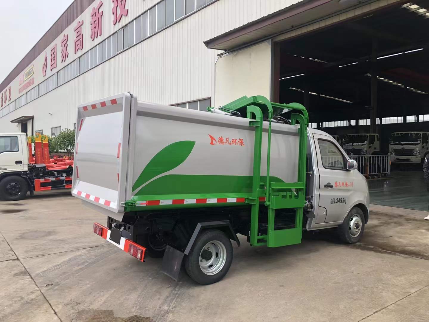 車廂由密封式垃圾廂、液壓系統(tǒng)、操作系統(tǒng)組成。一車可對應(yīng)多個垃圾桶,可自行吊上放下,上下一次工作循環(huán)時間≤50S。車廂為自卸式,雙頂小三節(jié)油缸,箱體尾部為手動密封蓋,四周安裝密封條,進料口帶液壓膠條。大廂前后及頂部安裝加強筋,防止貨物卸裝與廂體產(chǎn)生裝機,車輛右側(cè)安裝提升機及爬梯.