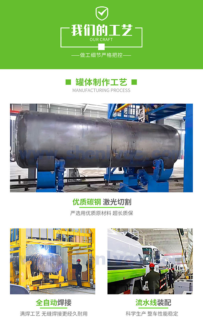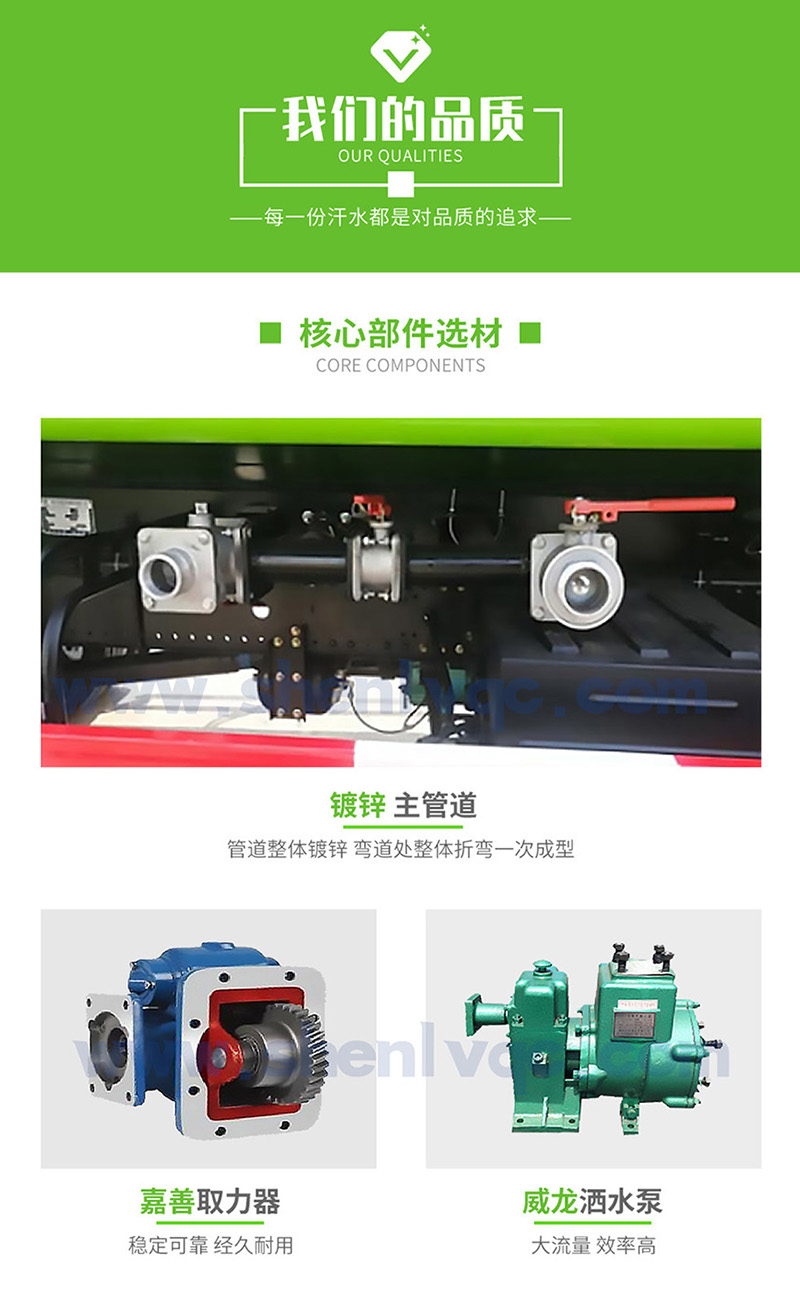 ①大鴨嘴前沖噴頭,萬向前沖球閥;②選裝氣動球閥駕駛室內控制;③選裝自動灑水炮;④選裝LED箭頭燈,長條警燈;⑤選裝食品級304不銹鋼罐體;⑥選裝后加大工作平臺+霧炮機組;⑦選裝新款標準化外形。 |
